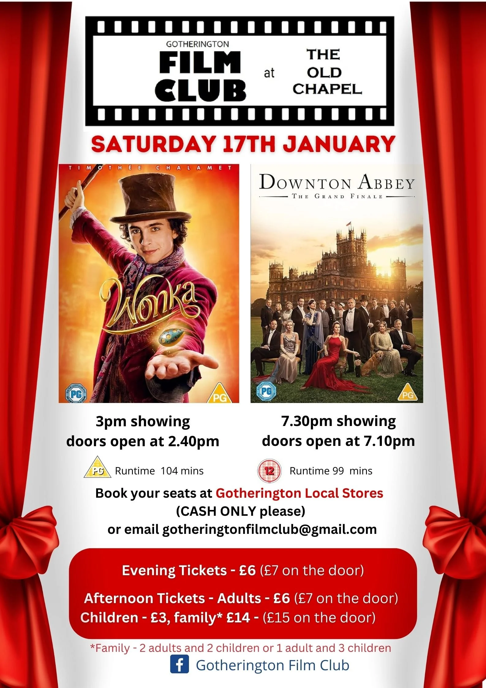 Tickets are available from Gotherington Stores (cash only please) or you can email gotheringtonfilmclub@gmail.com and pay by BACS.