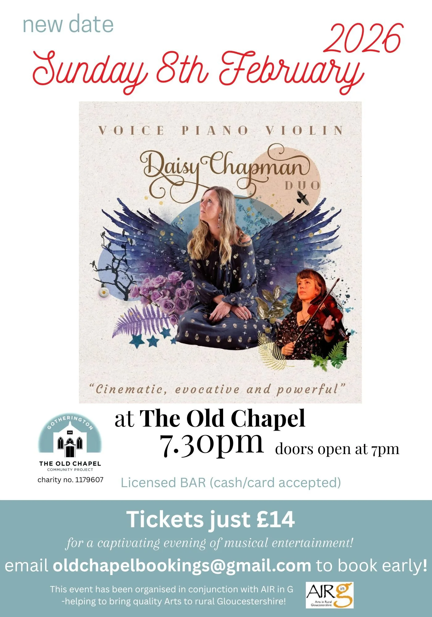 Songwriter, vocalist and pianist Daisy, and violinist Sue perform dark stories from history on voice, piano and violin. Daisy’s voice can certainly tell a story, but accompanied by violin the music takes you places beyond imagination! Daisy’s music may be dark, beautiful, filmic, but the evening her and Sue present is far from gloomy. The stories behind each song are told in an animated and comedic way whether it’s a nod to women of the world whose work was credited to men, or a creepy Victorian poem set to music, The Daisy Chapman Duo will not disappoint.